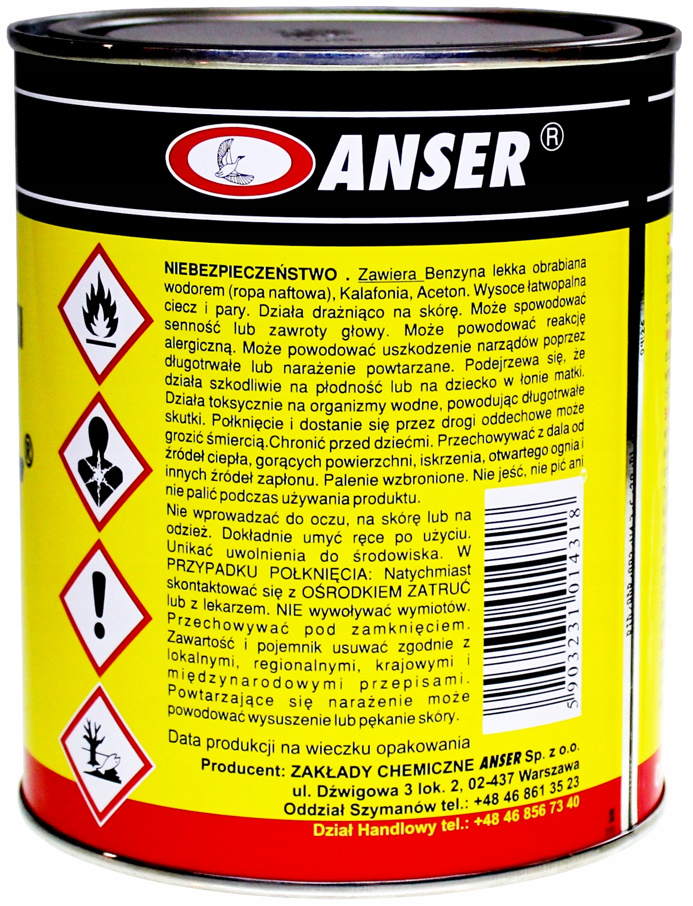 Zawiera: niskowrzącą frakcję naftową obrabianą wodorem, kalafonię, aceton.