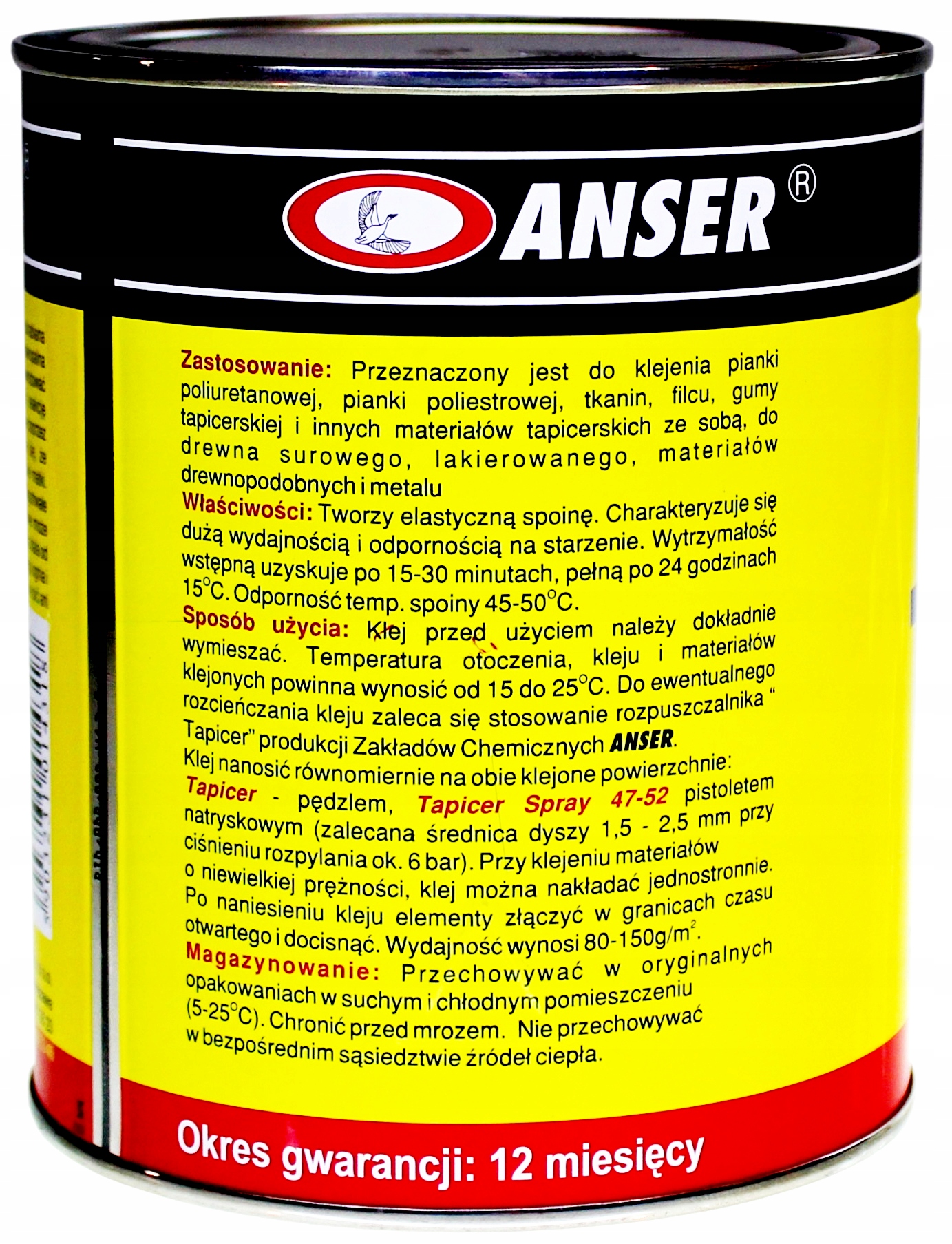 Przed użyciem klej należy dokładnie wymieszać. Temperatura kleju, materiałów klejonych i otoczenia powinna mieścić się w granicach od 15 do 25 Stopni Celsjusza. Do ewentualnego rozcieńczania kleju zaleca się stosowanie rozpuszczalnika „TAPICER” ANSER. Klej należy nanosić równomiernie na klejoną powierzchnię. Przy klejeniu materiałów o małej prężności można nakładać go jednostronnie, a następnie złączyć i docisnąć.