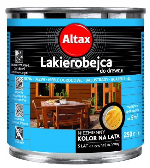 Lakierobejca do drewna Altax pozwoli zabezpieczyć powierzchnię przed szeregiem niekorzystnych czynników zewnętrznych – takich jak niskie temperatury, biokorozja czy też promieniowanie UV. Produkt nadaje się do stosowania zarówno na meblach ogrodowych, jak i do zabezpieczenia balustrad bądź okien. Preparat jest dostępny w odcieniu Palisander, który został dodatkowo podkreślony efektownym półpołyskiem.