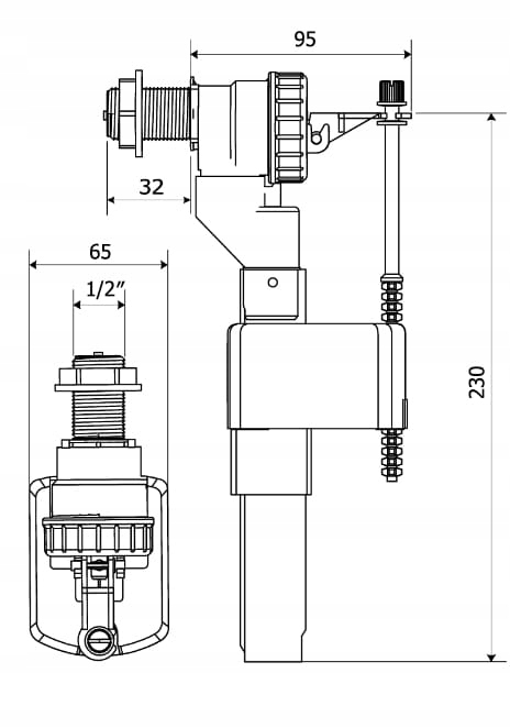 Zawór napełniający boczny o średnicy 1/2″ polskiej firmy KK-POL przeznaczony jest do zbiorników ceramicznych lub plastikowych z bocznym zasilaniem.