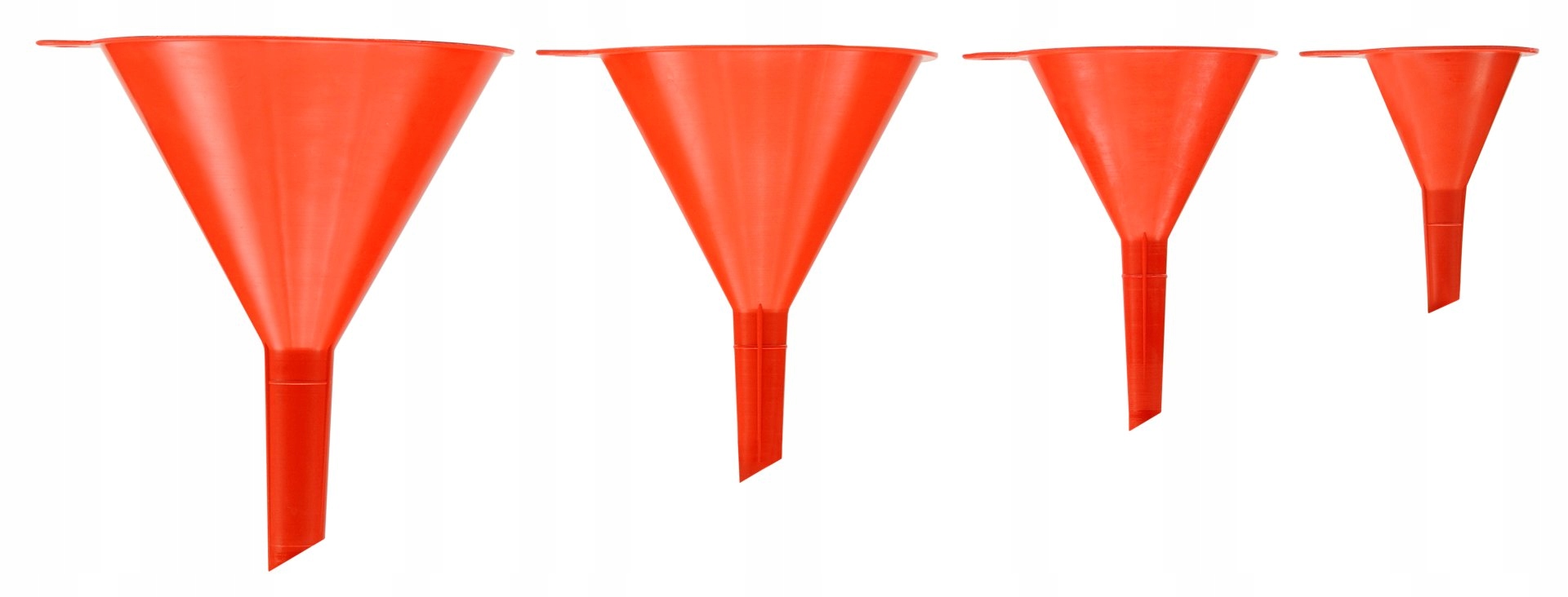 Zestaw 4 uniwersalnych lejków z tworzywa sztucznego o różnych średnicach (52, 76, 100, 120 mm). Przydatny w domu, garażu i warsztacie.