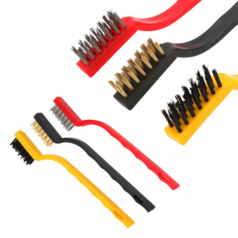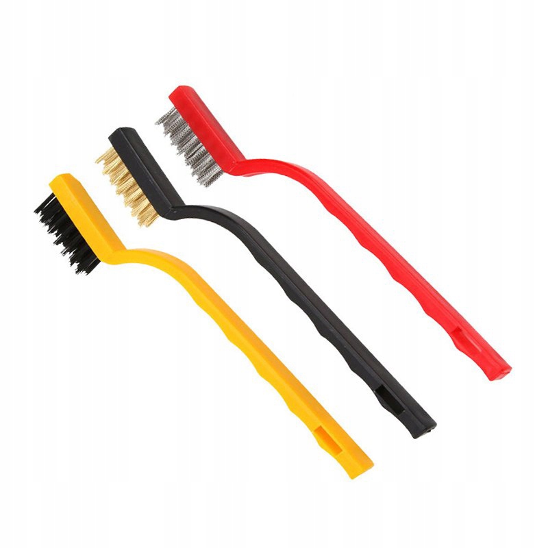 Zestaw trzech drucianych szczotek technicznych o długości: 16 cm, przeznaczonych do usuwania zanieczyszczeń z różnych materiałów. Korpusy szczotek wykonane z twardego tworzywa sztuczka – wyprofilowane w sposób zwiększający efektywność czyszczenia.