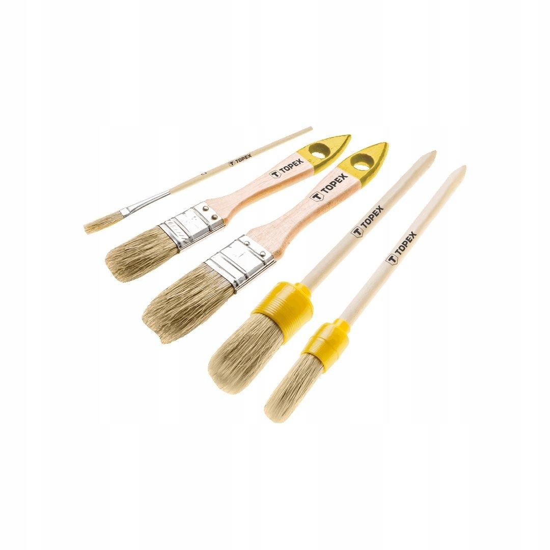 Zestaw pędzli TOPEX (nr ref. 20B816) w skład zestawu wchodzi 5 szt. pędzli, w tym 2 pędzle płaskie w rozmiarach 1" i 1.5", pędzle owalne nr 2 i 4 oraz pędzel mini. Są to pędzle o uniwersalnym zastosowaniu. Zestaw pędzli TOPEX będzie przydatny podczas drobnych prac malarskich i remontowych. Marka TOPEX skierowana jest do majsterkowiczów.